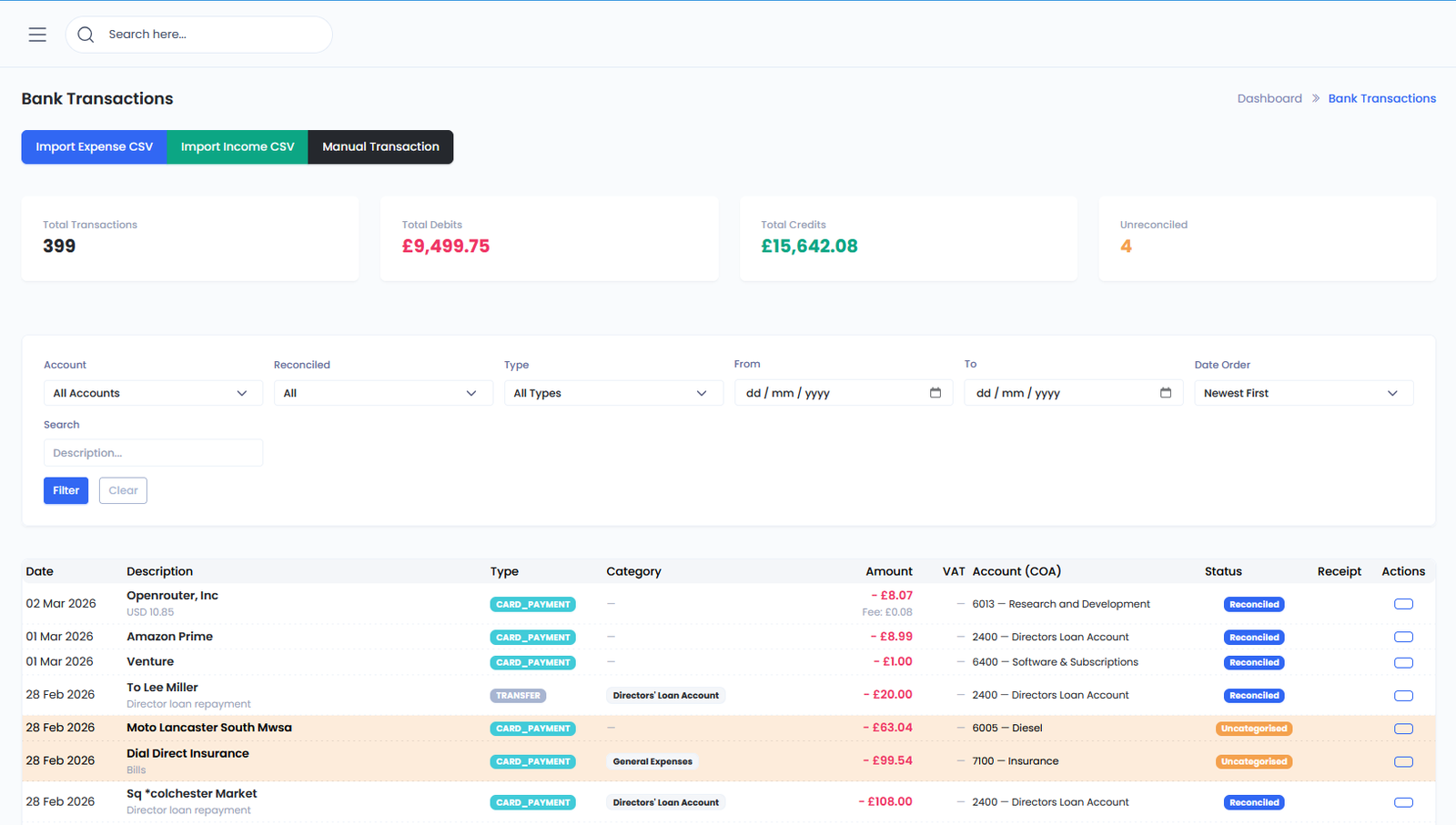 Import Income and Expenses using a bank downloadable .CSV file. Match to invoice / receipt for quick reconcile.